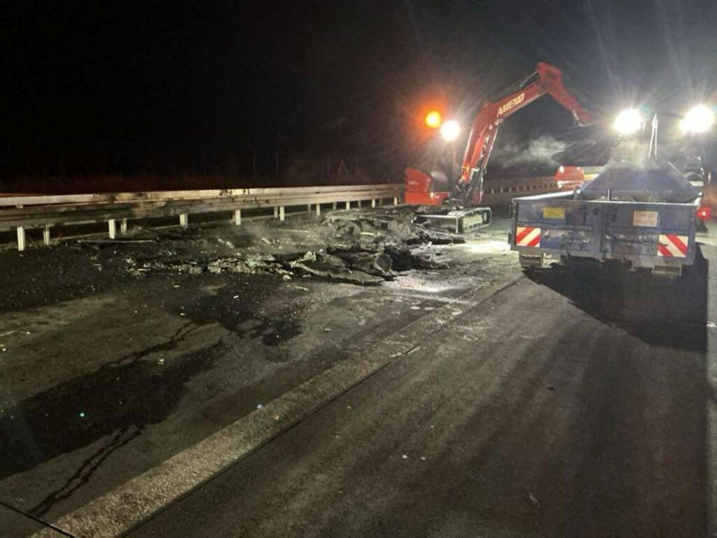 Das Ausmaß der Schäden sei enorm gewesen, berichtet der Fachmann aus Grünberg. Die betroffene Fahrbahn wurde durch den über 1000 Grad heißen Brand vollständig zerstört. Die Drainageleitungen sowie Kanalsysteme waren stark betroffen und kontaminiert. „In der ersten Nacht von Montag auf Dienstag war unser Havarie- und Notfallmanagement mit einem Einsatzleiter und sechs Fachkräften plus Sanierungsbüro – einem Gutachter – im Einsatz.“