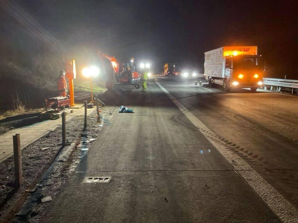 Unmittelbar nach Abschluss des Feuerwehreinsatzes und der Bergung des Lkw-Wracks begann noch in der Nacht von Montag auf Dienstag die aufwendige Bodensanierung. Dabei wurde die stark deformierte Schutzplanke demontiert und abtransportiert. Über 100 Tonnen kontaminiertes Erdreich aus der Außenbankette mussten ausgebaggert und unter gutachterlicher Begleitung fachgerecht entsorgt werden. Anschließend erfolgten die Wiederverfüllung und die Modellierung sauberer Bereiche. Am Dienstag und Mittwoch wurde zusätzlich der Bereich der Mittelleitplanke vollständig saniert.